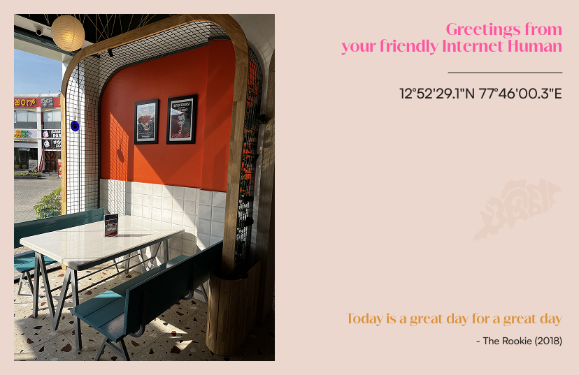 As a small gesture of appreciation of meeting new people everyday, I handout postcards at almost every meetup I go to. Each postcard contains a picture that I have personally clicked alongwith co-ordinates of the location of the picture and a favourite quote of mine from a movie/game/show.