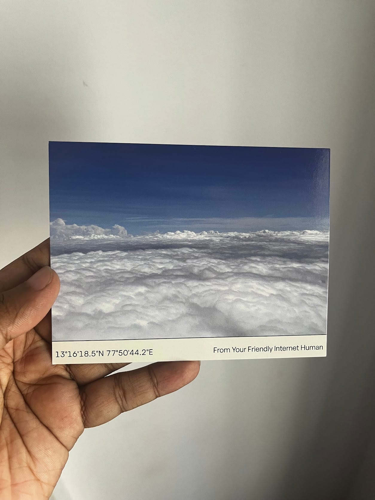 As a small gesture of appreciation of meeting new people everyday, I handout postcards at almost every meetup I go to. Each postcard contains a picture that I have personally clicked alongwith co-ordinates of the location of the picture and a favourite quote of mine from a movie/game/show.